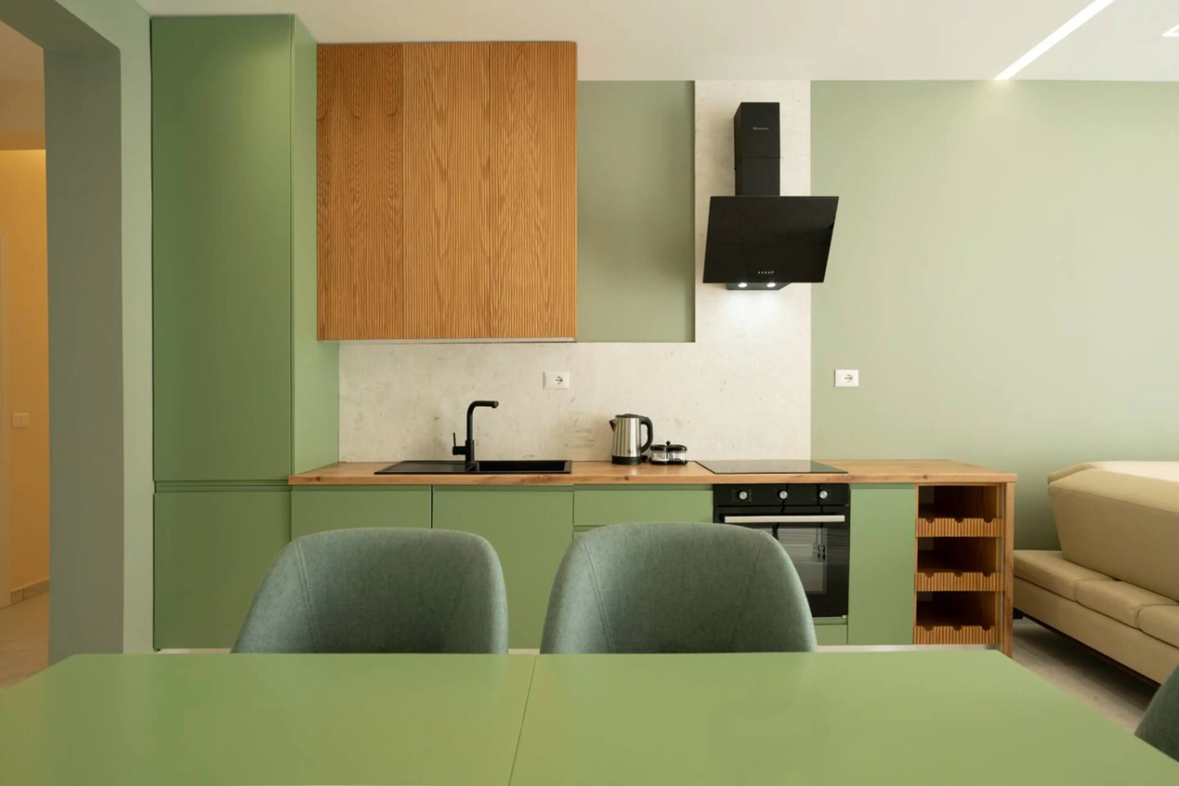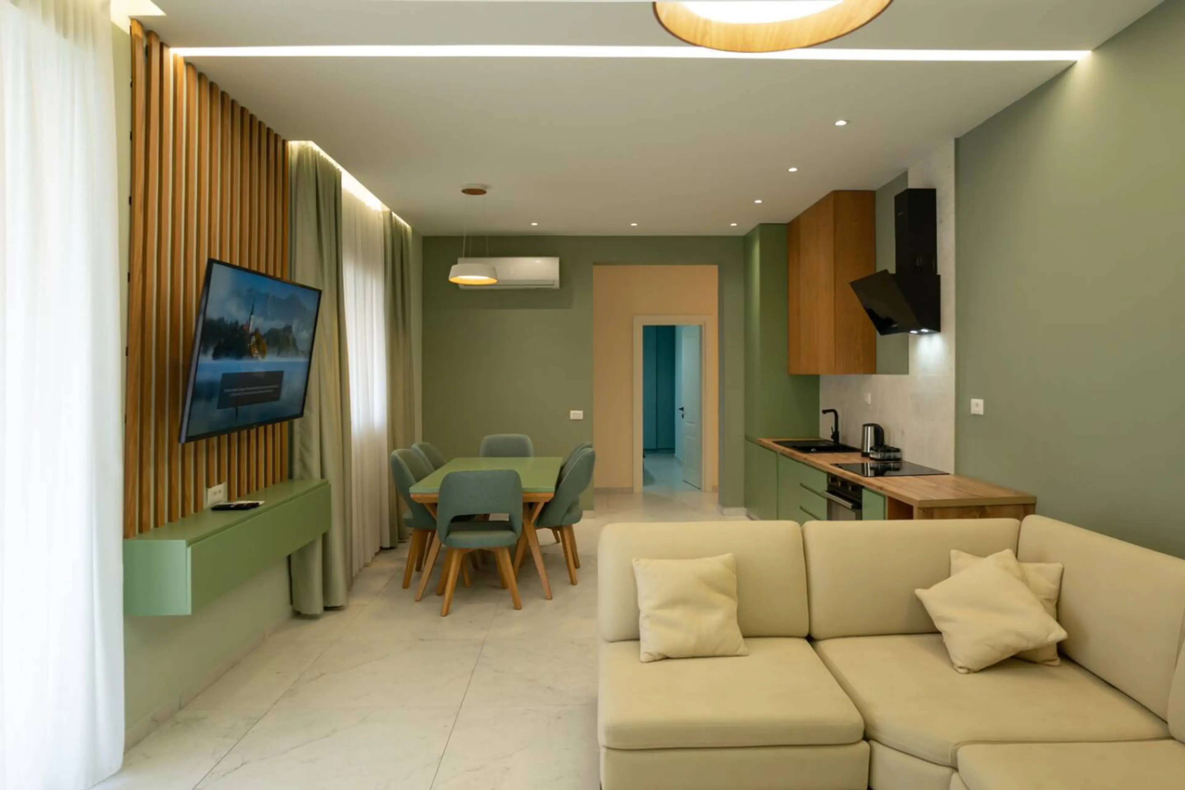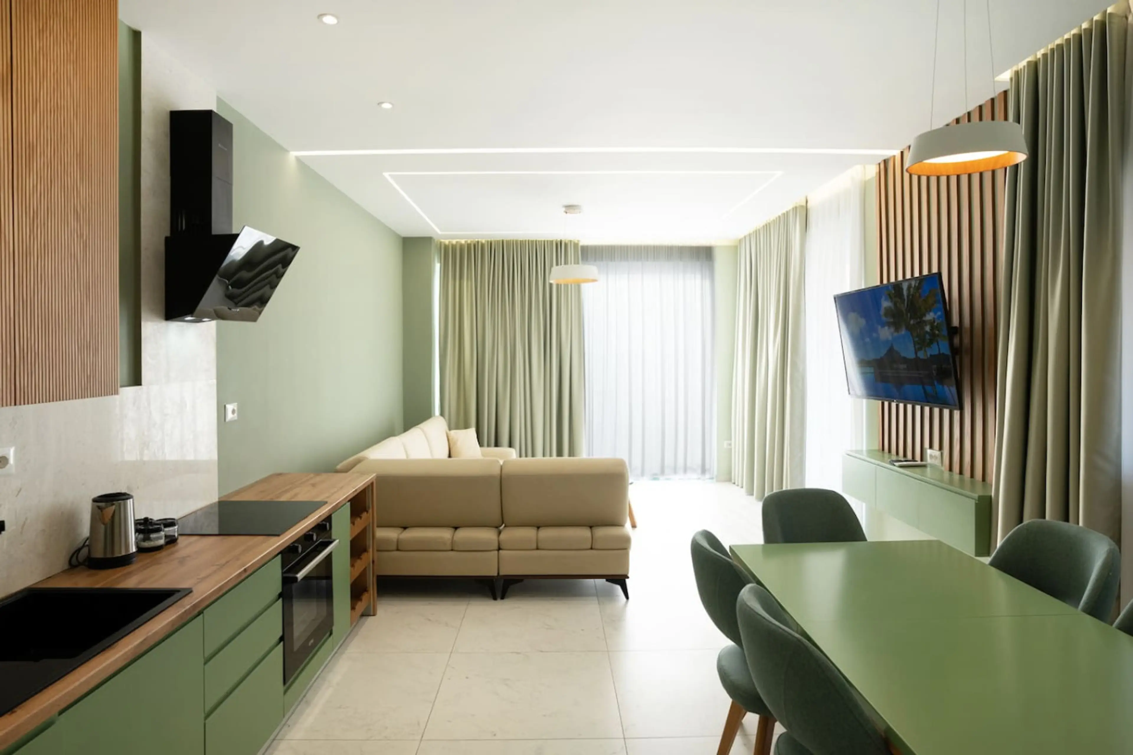 Wake up to the sound of the sea in this beautifully styled two-bedroom apartment featuring a full panoramic sea view. Thoughtfully designed in calming green and beige tones, the space brings a sense of peace and relaxation throughout. Both bedrooms are cozy and inviting, perfect for restful night...